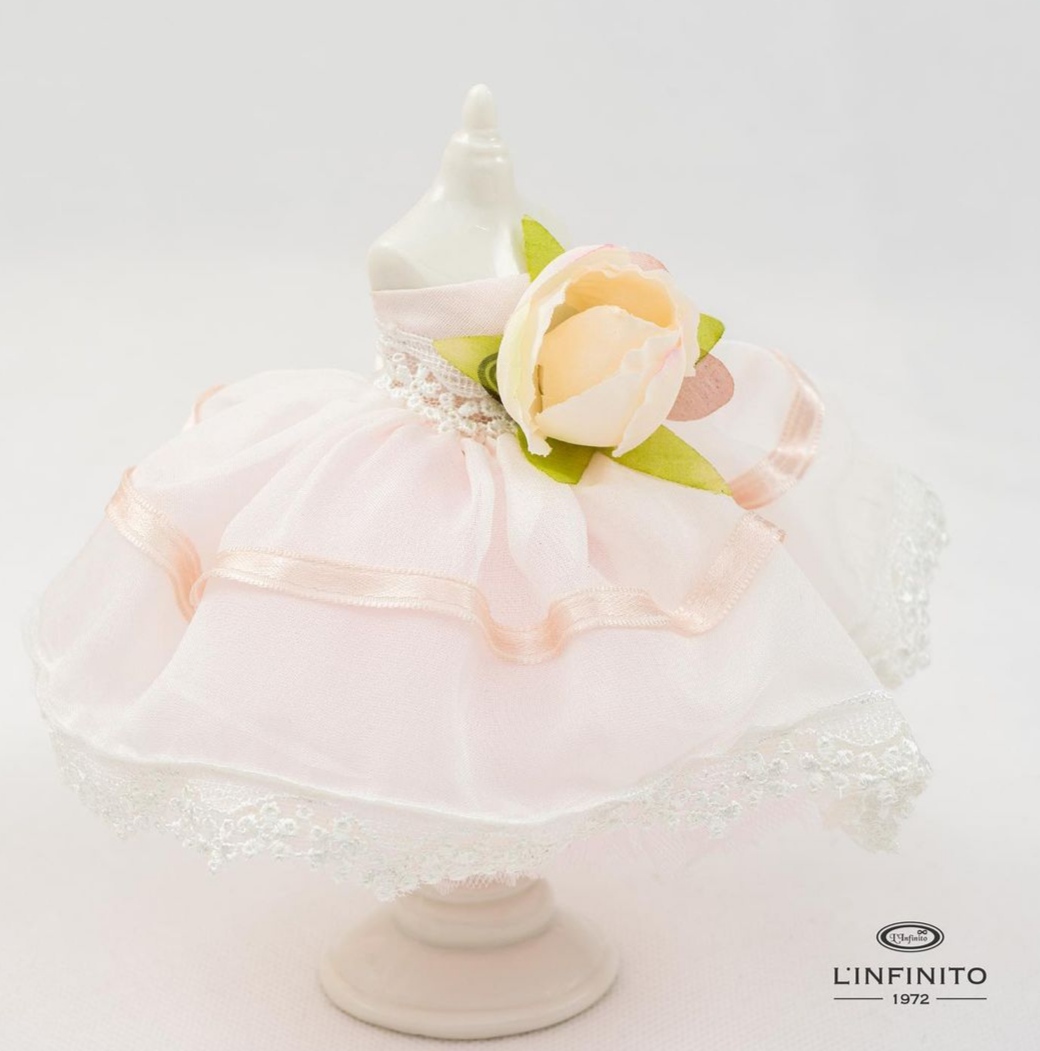 manichino in porcellana con vestito principesco rosa con pizzo macramè h. 15cm ca.