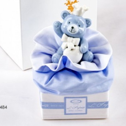 orsetto in porcellana celeste con cuore e corona su pouf quadrato 8cm x 8 cm x 12,5 cm