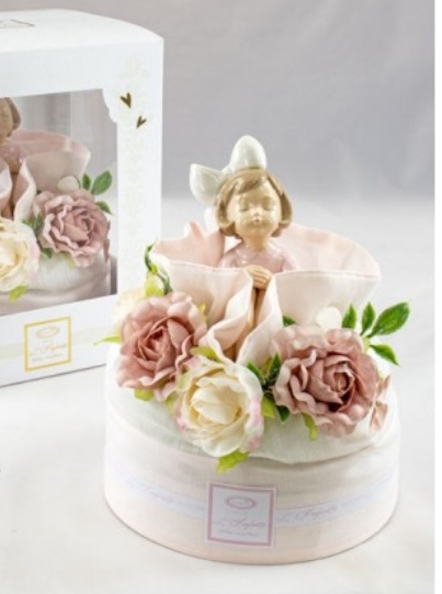 pouf tondo grande rosa e bianco con bimba in porcellana  seduta su tralcio di fiori su tono. d. 17 cm x h. 8 cm